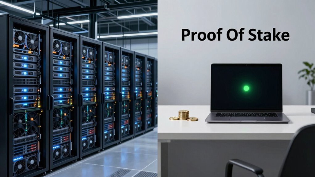 Imagine a city where miners and stakers are the builders shaping its future. Proof of Work’s high energy costs may foster stability through strong economic incentives, but could hinder widespread adoption. Proof of Stake encourages inclusivity, reducing costs and promoting cryptocurrency stability long-term. While PoW might secure legacy assets, PoS’s scalability could lead to more dynamic economies. Your choice influences the network’s resilience, growth, and economic sustainability over time.