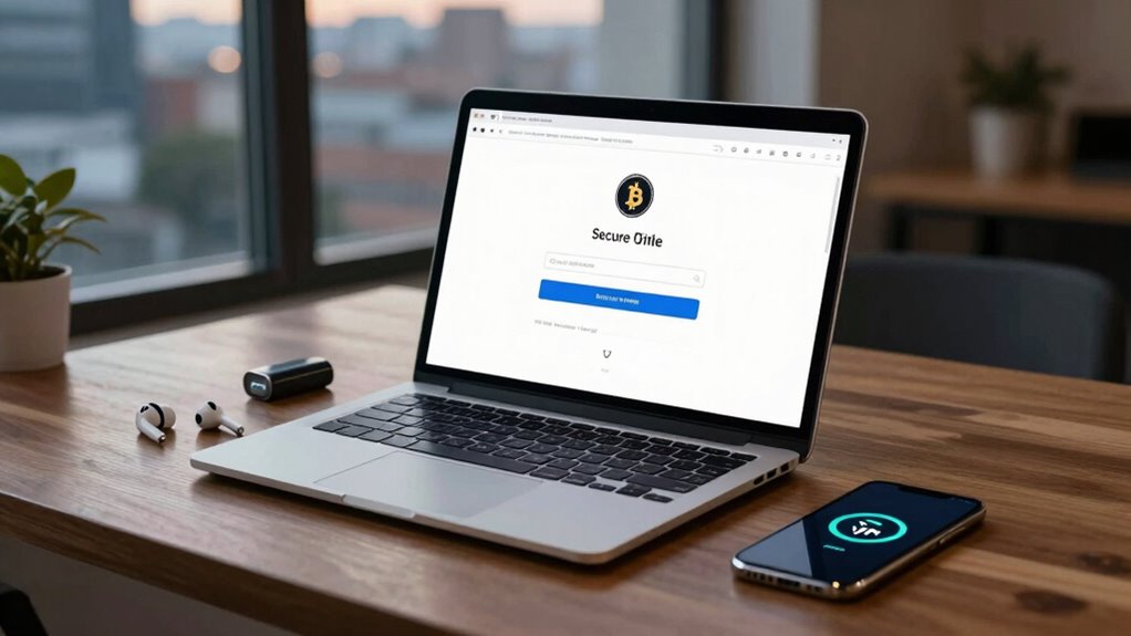 To safely access your crypto accounts remotely, always connect through a secure, encrypted Wi-Fi network, preferably WPA3 or WPA2. Use a trusted VPN to create a secure tunnel, especially on public or untrusted networks, adding an extra layer of protection. Avoid logging in on open, unsecured Wi-Fi. Instead, opt for a personal hotspot or a trusted network whenever possible. Keep your device updated and follow best cybersecurity practices—more tips await if you continue exploring.