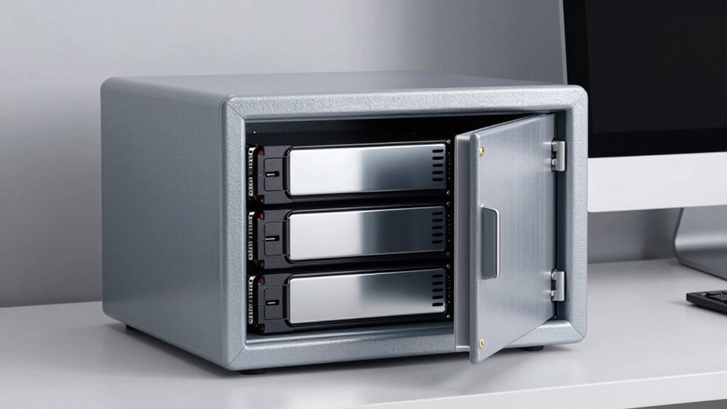 Media safes are specialized containers designed to protect your hard drives, SSDs, and backups from heat, water, and theft. They’re built with fire-resistant materials and thermal insulation to withstand extreme temperatures, keeping your data safe during fires. Waterproof features guard against water damage from floods or leaks. Plus, tamper-proof locks and reinforced shells prevent unauthorized access. If you want to learn more about choosing the right safe for your needs, stay tuned.