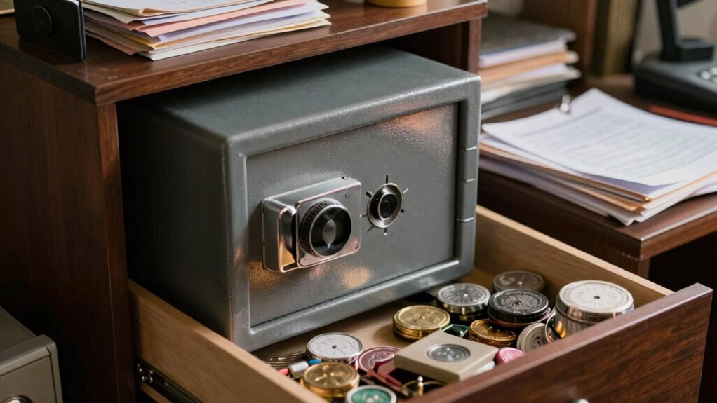 You should keep valuables like jewelry, cash, or important documents in small safes. They’re perfect for discreet storage, especially when hidden compartments or portable safes are used, making theft more difficult. However, avoid relying solely on small safes for security. Use them as part of a layered approach, combining them with other safety measures, since determined thieves can still access portable safes or discover hidden compartments.