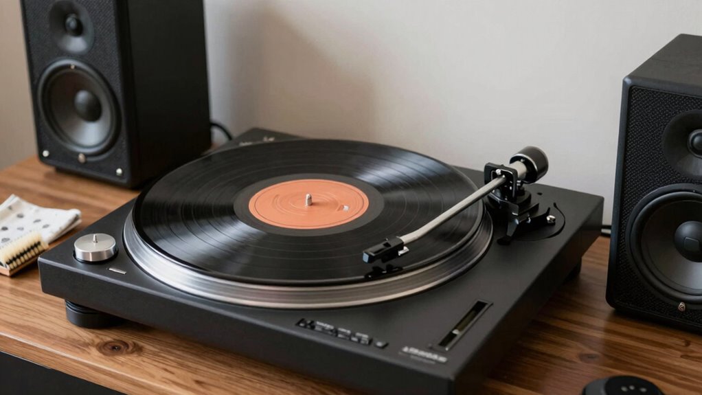 Once you have your turntable, consider the essential turntable accessories that will enhance your vinyl experience. A good slipmat prevents slipping and reduces static, which can affect sound quality. An anti-static brush is a must-have for cleaning your records before and after playing to avoid dust and static buildup. For better sound, you might want to invest in a quality cartridge and stylus, which greatly influence audio clarity. A record weight or clamp can also improve contact between the record and platter, leading to fewer vibrations and better sound. These accessories not only improve your listening experience but also help preserve your records, extending their lifespan.