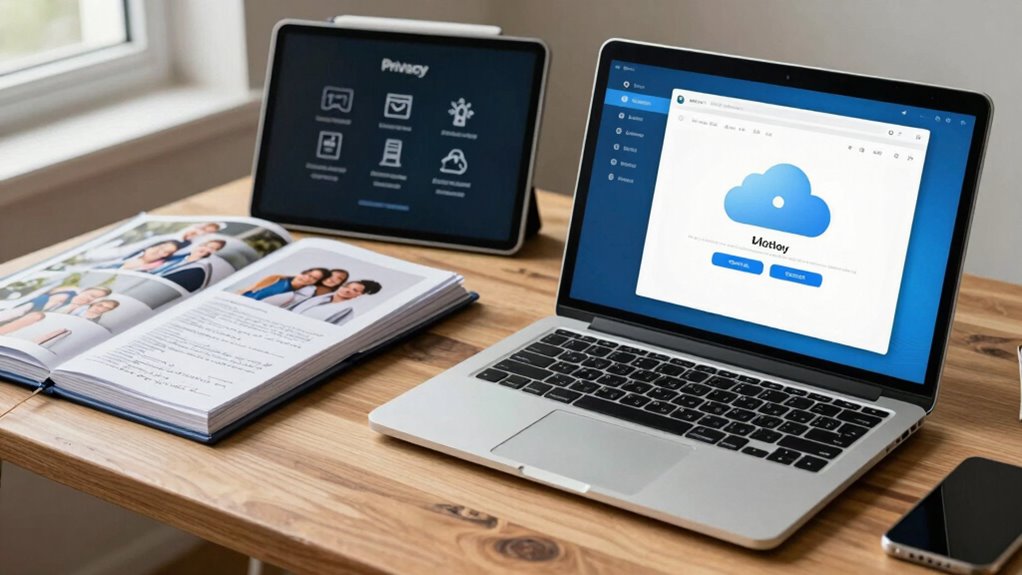 When using cloud storage for family documents, it’s essential to review and adjust privacy settings regularly. Check who has access, set permissions for view, comment, or edit, and use password-protected links with expiry dates. Enable two-factor authentication and avoid sharing access broadly. Regularly monitor permissions and revoke access if needed. Keeping these settings secure helps protect your family’s sensitive data—continue exploring how to strengthen your privacy measures even further.