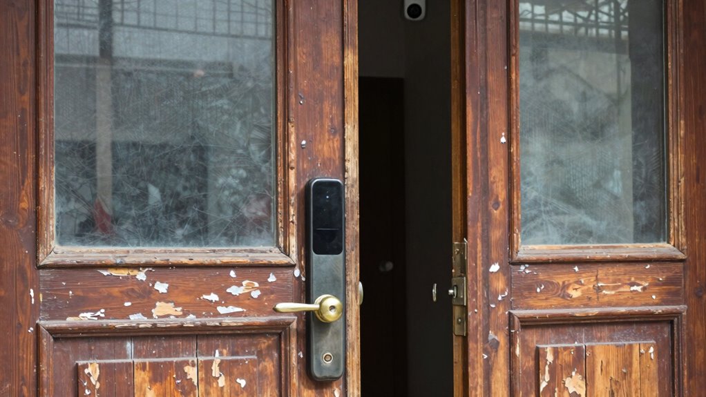 Have you ever wondered how secure your front door truly is? It’s often the first line of defense against intruders, yet many underestimate its vulnerability. Modern security measures have evolved markedly, with smart lock technology leading the way. These locks offer more than just convenience; they bring advanced features like remote access, temporary codes for visitors, and activity logs that let you monitor who enters and exits your home. Installing a smart lock means you can lock or unlock your door from anywhere, giving you peace of mind even when you’re away. Plus, many models integrate with your home security system, providing an all-encompassing approach to safeguarding your property. But relying solely on high-tech solutions isn’t enough. Visual deterrent strategies play an essential role in preventing break-ins before they even happen. Simple measures like a sturdy, clearly visible doorknob lock, security cameras, or a “Beware of Dog” sign can discourage potential intruders from even attempting to break in. These visual cues tell burglars that your home is protected, making it less attractive as a target. Combining smart lock technology with visible deterrents creates a layered defense that’s hard to bypass. You want to make it as inconvenient as possible for someone to break in, and that starts at the front door. Reinforcing your door with a solid frame, using deadbolt locks, and ensuring your locks are resistant to picking or forced entry are essential steps. It’s also a good idea to keep your porch well-lit at night, making it harder for intruders to approach unnoticed. When you think about home security, it’s easy to focus on alarm systems or surveillance cameras, but the front door remains the pivotal point of entry. Securing it properly requires a combination of innovative technology and strategic visual cues. By investing in smart lock technology, you’re gaining control over your home’s access points, while visual deterrent strategies send a clear message to would-be intruders that your home is protected. The use of smart lock technology is becoming increasingly popular and effective in home security. Don’t wait for a break-in to realize the importance of securing your front door. Instead, take proactive steps now to fortify your entry point and protect your home from potential threats. The effort you put into strengthening your front door can make all the difference in preventing crime, giving you peace of mind and keeping your loved ones safe. Additionally, understanding the importance of home security components can help you develop a comprehensive approach to safeguarding your entire property. Implementing modern security solutions can further enhance your home’s defenses and adapt to new threats as they arise.