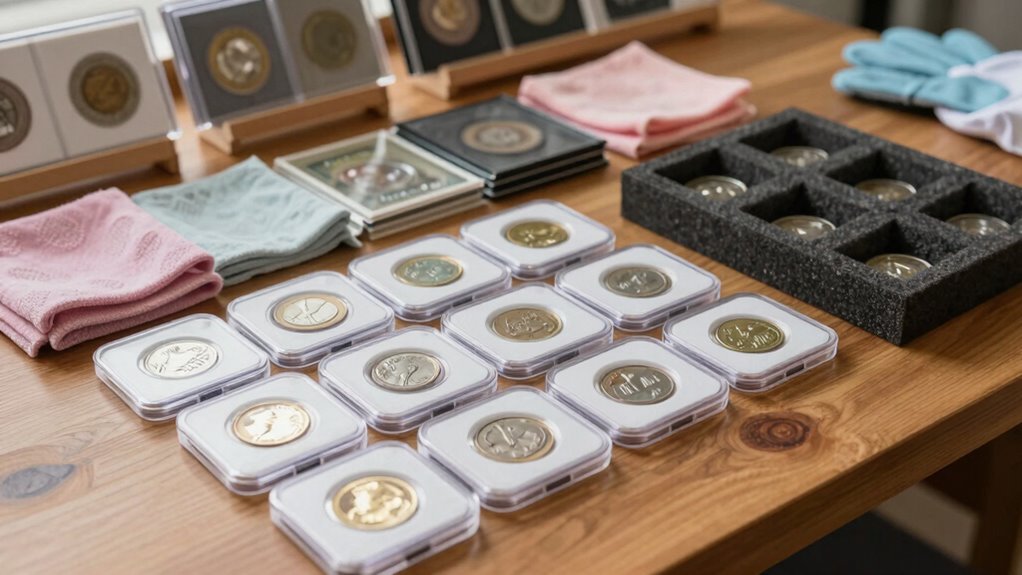 Worried about tarnishing your coins during the show? You can prevent this by avoiding harsh coin cleaning and sticking to proper storage techniques. Use airtight holders or coin capsules, and keep coins in a cool, dry environment away from direct sunlight. Do you really want your coins to lose their luster? Regularly inspect and clean them gently with appropriate materials to maintain their condition, ensuring they shine brightly throughout the event.