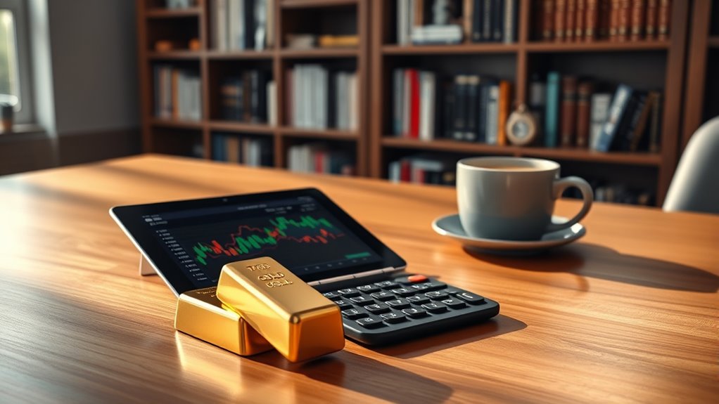 Adding gold to your portfolio can indeed reduce its overall volatility. You benefit from its low correlation with stocks and bonds, which helps smooth out fluctuations during economic downturns. By allocating around 10% to gold, you create a diversification boost that lowers maximum drawdowns and stabilizes returns. Gold acts as a safe haven, providing a buffer during turbulent times, ultimately making your portfolio more resilient and less prone to sharp swings.