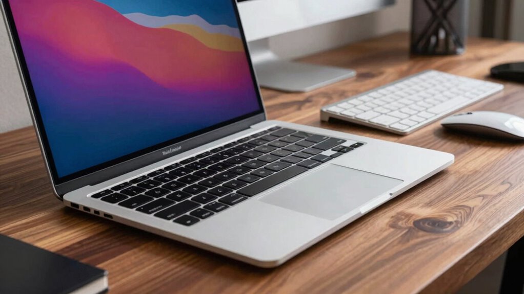 Choosing a 15-inch MacBook Air with the right processor power and speed is essential for guaranteeing smooth performance and multitasking. A more powerful processor, like a 10-core CPU with performance and efficiency cores, boosts overall speed and handles demanding tasks effortlessly. Upgrading to higher GPU cores, such as 8 or 10, markedly improves graphics, ideal for creative work and gaming. The Neural Engine’s size and speed influence AI features like image processing and voice recognition, making interactions more responsive. Faster media engines with hardware-accelerated decoding and encoding support smooth video editing and multimedia workflows. Opting for the latest generation processors ensures better performance for future applications, providing longevity and reliability. Balancing these aspects helps you choose a MacBook Air that meets both current and future needs.
