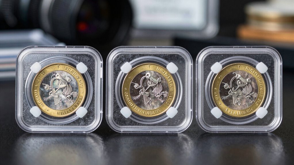 Choosing the right air-tite coin holder can truly elevate your collection, protecting it like a fortress guards its treasures. With options like Y-65mm capsules, durable storage tubes, and 40mm capsules, you’re equipped to preserve your coins for generations. Remember, the perfect holder isn’t just a container—it’s the guardian of your numismatic legacy. Invest wisely, because your collection deserves nothing less than the best—truly, it’s an investment in history itself.
