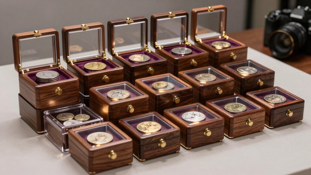 Organizing and accessing coins depends on the box type you choose. I find that clear, stackable boxes are like a treasure chest—easy to see and reach my collection. Slide-out drawers make it simple to find specific coins without hassle, while coin albums keep everything orderly and accessible. No matter the style, a well-designed box turns coin storage into a smooth, satisfying experience, making your collection a joy to explore.