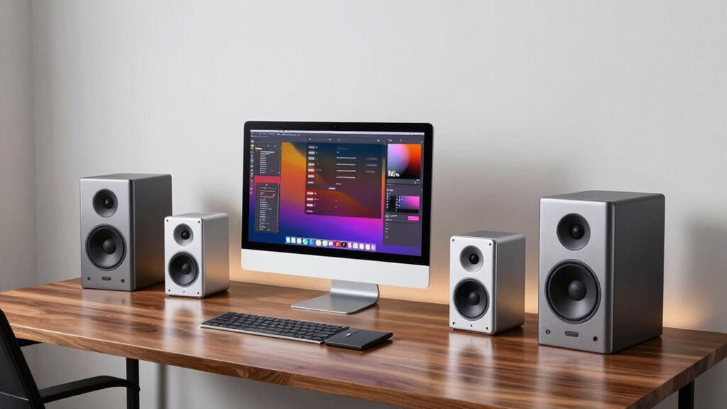I recommend pairing your compact Mac workstation with a high-quality external monitor like the LG UltraFine for sharp visuals. Add a reliable keyboard and mouse, such as the Apple Magic Keyboard and Magic Mouse or Trackpad, for seamless control. An external storage solution, like a Samsung T7 SSD, boosts capacity and speeds up workflows. Don’t forget good speakers or headphones for audio, and a sturdy dock to keep everything organized and accessible.