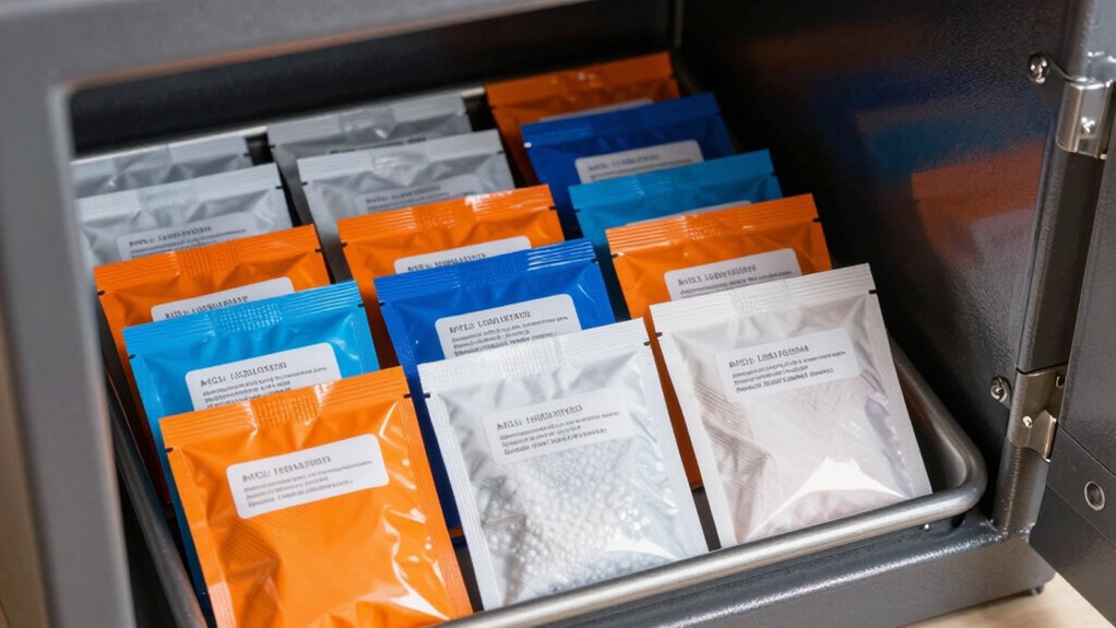 Did you know that some desiccants can prevent corrosion by up to 90%? I always recommend choosing desiccants tailored to your safe’s materials. For delicate items like jewelry or paper, silica gel is gentle and effective. If you’re storing metal valuables, consider clay-based desiccants that absorb moisture without causing harm. Matching the desiccant to your safe’s contents guarantees ideal protection and peace of mind.