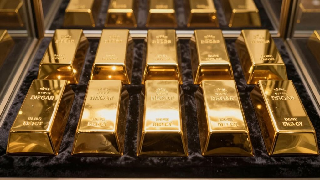 The weight limits for gold bar display stands vary, but most can hold between 5 to 50 pounds. For smaller bars, like 1-ounce or 10-ounce pieces, a stand with a 5-10 pound capacity usually suffices. Larger, heavier bars require sturdier stands rated up to 50 pounds or more. Always check the manufacturer’s specifications to guarantee your stand can safely support your gold bars without risk of damage or tipping.