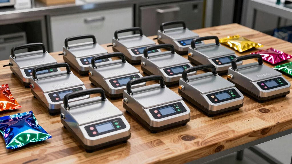 Selecting the right sealer size and portability is essential because it directly impacts how easily I can handle different bag widths and where I can use the device. If I plan to seal standard-sized Mylar bags, a sealer around 8 to 12 inches wide usually suffices. For larger or variable bag sizes, a wider sealer—up to 16 inches—offers more versatility. Portability matters if I want to move the sealer between locations or store it easily; lightweight models, weighing 1 to 5 pounds, are perfect for this. Compact sealers under 12 inches are ideal for home use or small-scale tasks, while bulkier, industrial-sized models are better suited for high-volume environments. Ultimately, choosing a size and weight that match my needs ensures efficiency and convenience.
