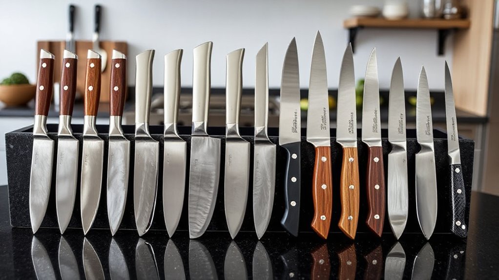 If you’re looking for the 15 best high-end chef knives for 2026, I’ve got you covered. From top Japanese swords like the Shun Premier and KAWAHIRO VG10 to premium sets like Wüsthof and Mitsumoto Sakari, these knives combine craftsmanship and cutting-edge materials for professional and home use. Whether you need a versatile set or a specialized Nakiri, these options are built for precision, durability, and beautiful design. Keep exploring to discover more details on each exceptional knife.