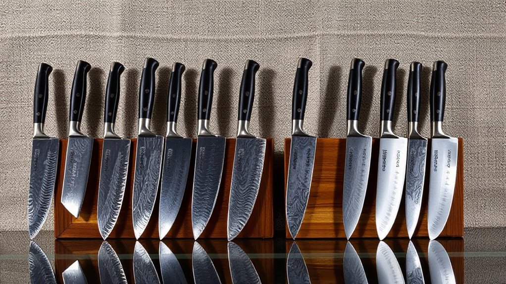 Choosing the right Japanese knife set hinges considerably on the quality of the blade material, as it directly impacts performance, durability, and maintenance. High-quality blades are usually made from high-carbon stainless steel or Damascus steel, which provide excellent sharpness and resilience. The steel’s hardness, measured in HRC, typically ranges from 58 to 62; the higher the HRC, the longer the edge stays sharp. Proper forging and layering, such as Damascus techniques or vacuum treatment, boost blade strength, corrosion resistance, and aesthetics. Steel composition, including chromium, carbon, and vanadium, influences rust resistance, toughness, and ease of sharpening. Consistent manufacturing processes, like precise heat treatment and sharpening angles around 15 degrees, are essential for ensuring the blade performs well and lasts over time.