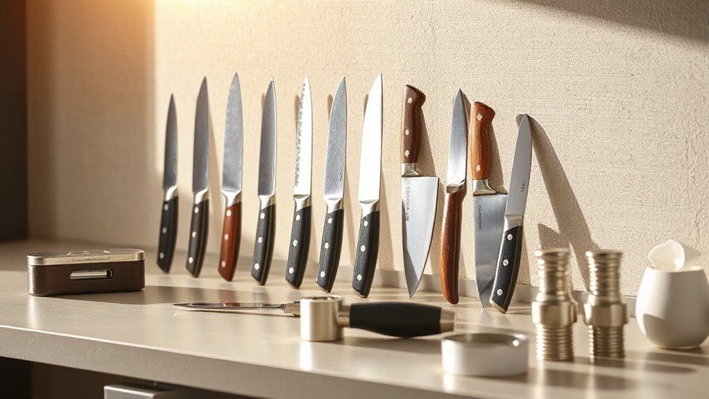 Think of sharpening like handling a delicate sword; safety is key. I always make sure to wear cut-resistant gloves and stabilize the knife on a secure surface. I keep my fingers away from the blade’s edge and use gentle, controlled strokes. Never rush—patience is your best friend. By staying focused and taking these precautions, I protect myself and keep my knives sharp without accidents.