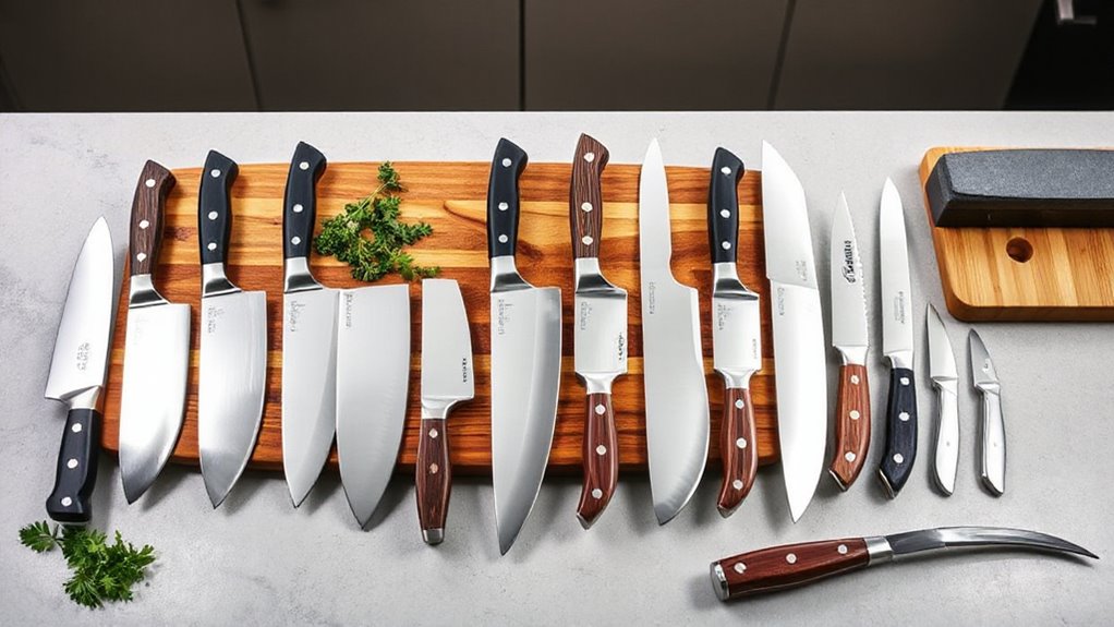 When choosing knives for culinary students, I focus on blade material quality and handle comfort to guarantee safety and ease of use. Sharpness longevity and set versatility are also key, so students can rely on their knives through various tasks. Ultimately, safety features play an essential role in preventing accidents and building confidence in new cooks.