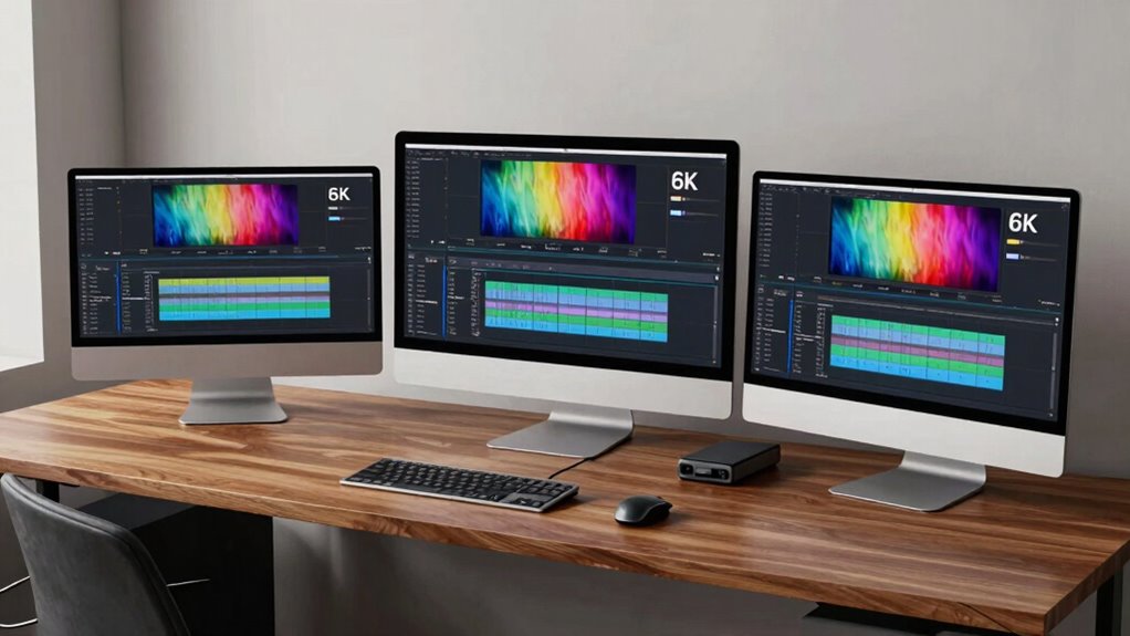 When choosing a Mac Studio for video editing, guaranteeing it supports multiple high-resolution displays is essential for an efficient workflow. You want a setup that can handle up to three monitors at 6K or 5K resolutions, providing plenty of screen real estate for editing tools and timelines. Check that the device has Thunderbolt 4 or Thunderbolt 5 ports, which support native DisplayPort output for flexible monitor connections. It’s important that the Mac Studio can manage high resolutions and refresh rates, such as 60Hz at 6K or 5K, to keep playback smooth. Additionally, verify support for both HDMI and Thunderbolt inputs, enabling versatile multi-monitor configurations. Supporting the maximum number of external displays with high resolutions guarantees seamless multitasking and an ideal video editing environment.