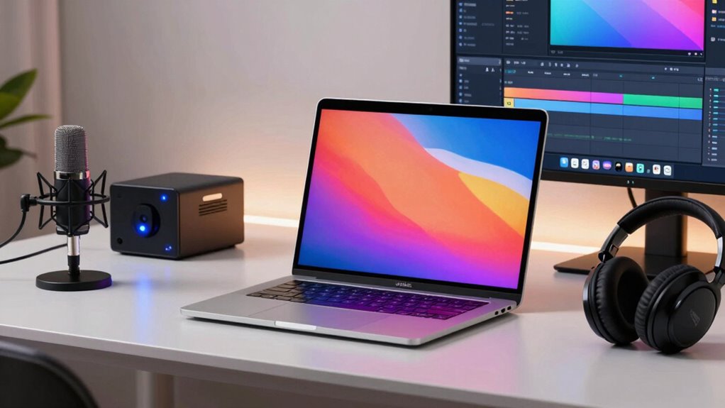 To guarantee smooth operation during live streaming and content creation, I need a MacBook Pro that supports the latest macOS updates, which guarantees compatibility with essential software like OBS, Final Cut Pro, and Adobe Creative Suite. A powerful processor, such as the M4 Pro or M4 Max, is essential to handle demanding editing, encoding, and streaming tasks seamlessly. I also look for at least 16GB of RAM to assure smooth multitasking across multiple applications without lag. High-quality integrated cameras and microphones, or support for external professional-grade peripherals, are crucial for prime video and audio quality. Additionally, robust graphics capabilities and a high-resolution display like Liquid Retina XDR enable precise video editing and real-time previews during streams. Compatibility and support are fundamental for a flawless content creation workflow.