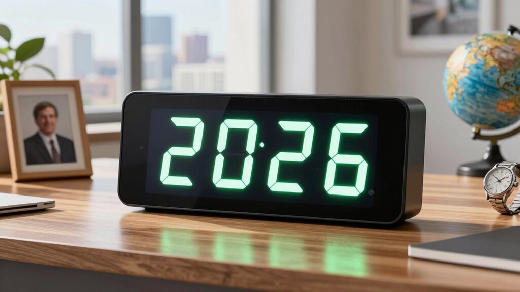 A clear and appropriately sized display is essential for effectively tracking your countdown to retirement. A large, easy-to-read display ensures you can see your remaining time at a glance, even from across the room. The size should match your environment—bigger screens work better in larger spaces or public areas. Digit size and font style also matter; bold, high-contrast numbers improve visibility, especially for those with visual impairments. Brightness and backlighting features can make a big difference in low-light settings or at night, ensuring the display remains visible without straining your eyes. Additionally, avoiding glare and reflections helps maintain clarity in various lighting conditions. Prioritizing display clarity and size guarantees you’ll always stay aware of your countdown to retirement effortlessly.