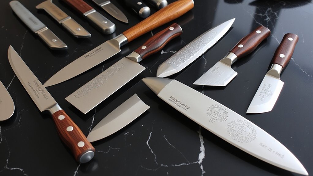 When selecting between santoku and chef knife sets, understanding their versatility is crucial because each type excels in different tasks. Santoku knives are lighter and shorter, making them perfect for precise slicing and dicing. Their narrower blades offer excellent control for delicate cuts, ideal for vegetables and thin slices. In contrast, chef knives are more versatile overall, suitable for chopping, slicing, mincing, and handling heavier ingredients. Their wider blades excel in chopping larger items and applying more force when needed. While both knives can handle most kitchen tasks, chef knives are better suited for demanding jobs that require strength and versatility. Ultimately, your choice depends on your specific cooking style and preferred handling, as each set brings unique strengths to different culinary tasks.