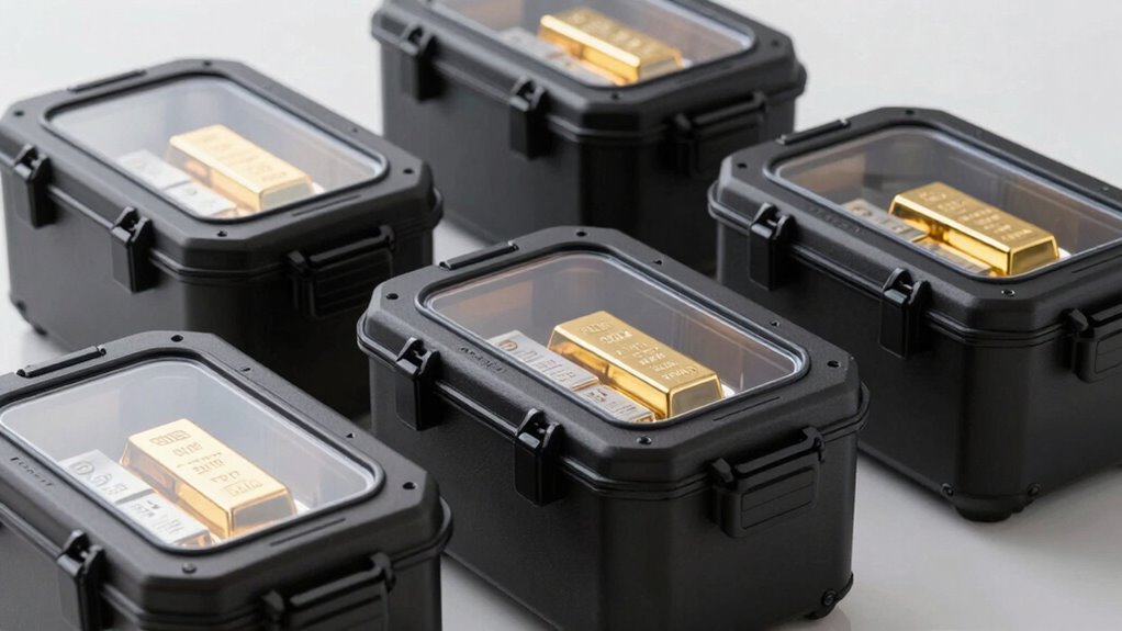 Choosing a waterproof storage container for bullion hinges on selecting durable materials that can withstand environmental stresses. Materials like stainless steel and military-grade aluminum resist corrosion and impact, making them ideal for outdoor use. Steel containers with thick walls and reinforced seals are better equipped to handle harsh conditions and physical shocks. The material you select directly affects the container’s lifespan, especially when exposed to moisture, UV rays, and temperature swings. Lightweight options like aluminum alloys offer a good balance of durability and portability, perfect for travel or outdoor activities. Keep in mind that material strength works best when paired with effective sealing mechanisms, such as rubber O-rings and compression-fit lids, to guarantee long-lasting waterproof protection.